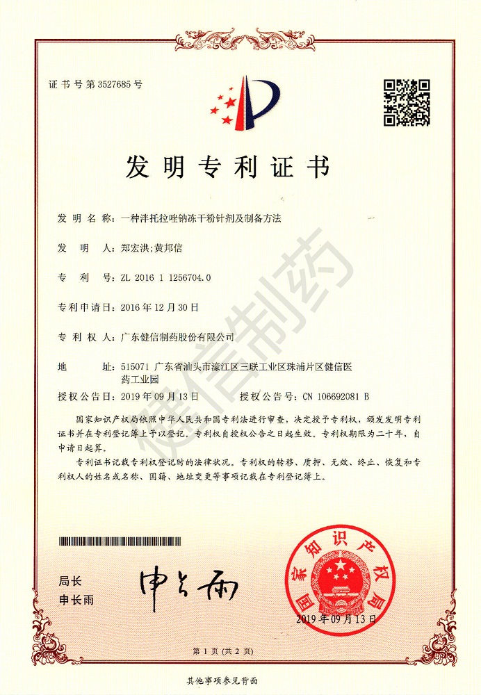 熱烈祝賀我公司《一種泮托拉唑鈉凍干粉針劑及制備方法》發(fā)明專利獲得國家知識(shí)產(chǎn)權(quán)局授權(quán),并于2019年09月13日獲得發(fā)明專利證書。